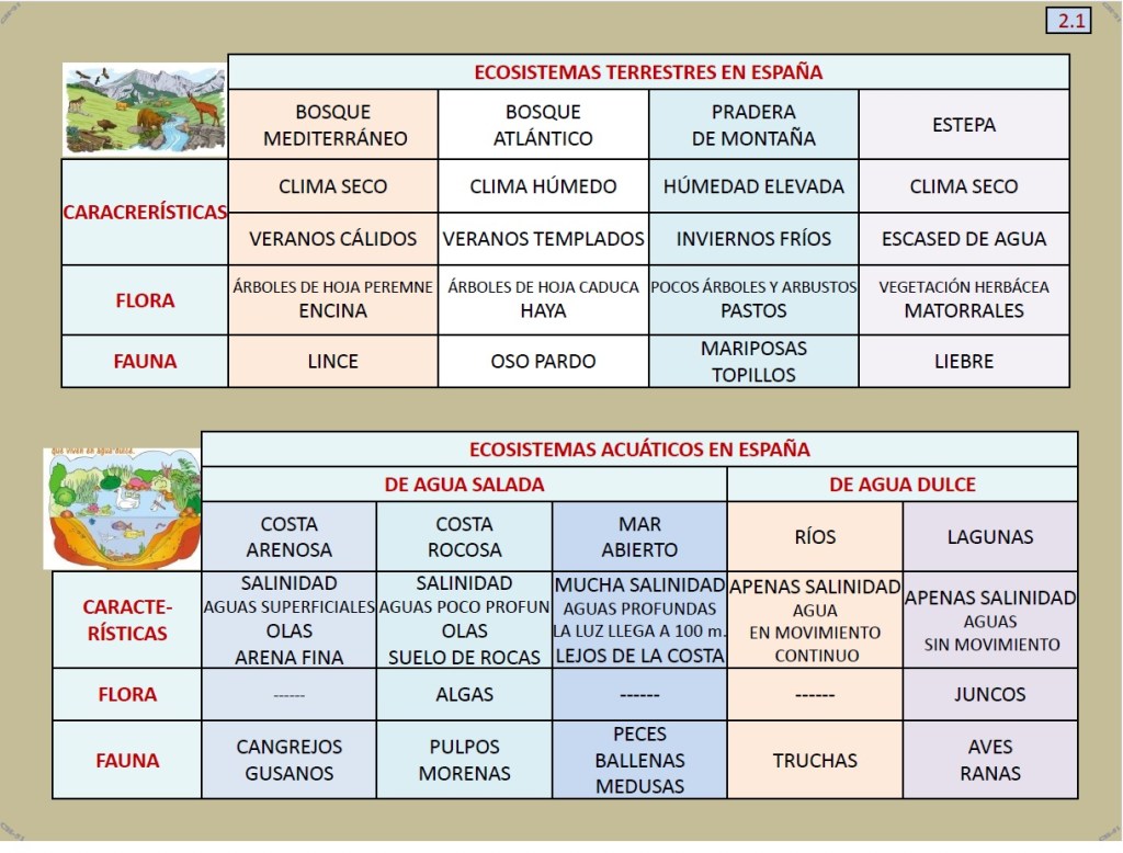 Hay 4 tipos de ecosistemas en España: Bosque mediterráneo, Bosque atlántico, Pradera de montaña y Estepa.