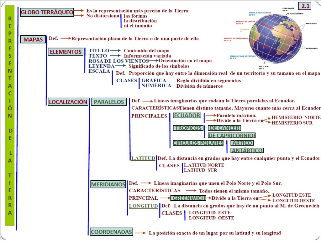 La tierra puede representarse de dos formas: en forma de globo, o plana. El globo terráqueo es la representación más precisa de la tierra porque mantiene su forma natural. Un mapa, en cambio, es una representación plana de toda la Tierra, (o de una parte de ella).