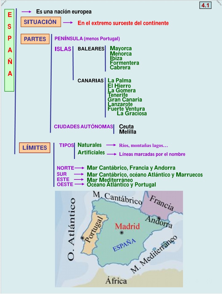 España es una nación europea que está situada en el extremo sur oeste del continente. Geográficamente, podemos distinguir tres partes: la parte de la península ibérica, menos Portugal; Los dos archipiélagos, Baleares en el mar Mediterráneo, y Canarias en el Océano Atlántico; Y las ciudades autónomas, Ceuta y Melilla, situadas en el norte de África.