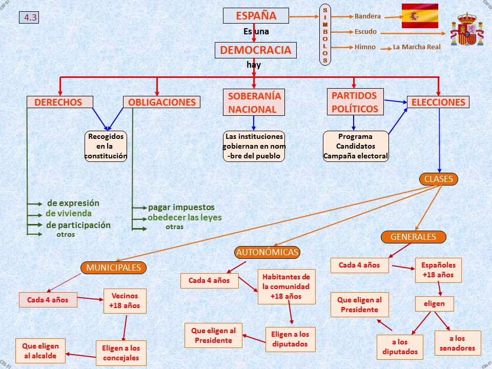 Soberanía nacional quiere decir que, en España, las instituciones gobiernan el nombre del pueblo. Los partidos políticos presentan un programa eligen a los candidatos y preparan la campaña electoral para las elecciones. Hay tres clases de elecciones: municipales, autonómicas, y generales.