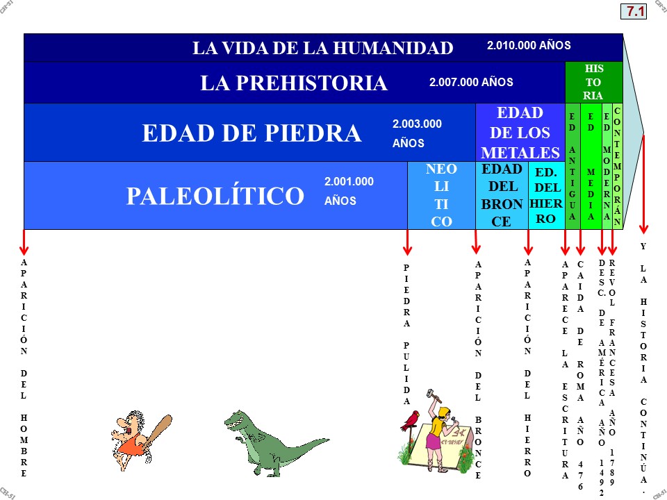 La Prehistoria es la parte de la Historia que va desde la aparición del hombre hasta la aparición de la escritura. Tiene dos partes: la Edad de Piedra y la Edad de los Metales.